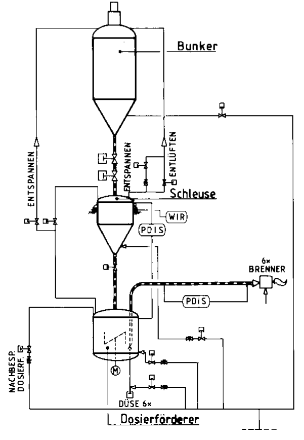 Die Versorgung von Steinkohlenzündbrennern [1, 2] ist beispielsweise mit deroben erwähnten Standardkombination nicht mehr betreibbar. EntsprechendeVersuche mit einer Zellenraddosierungbrachten keine befriedigenden Ergebnisse. Da die Flammenüberwachung auf lntensitätsschwankungen mit der Abschaltung des Brenners reagierten, sind selbsthöherfrequente Schwankungen, wie siedurch die unregelmäßige Kammerentleerung bei Zellenrädern hervorgerufen werden für eine sichere Anlagenfunktion untragbar.