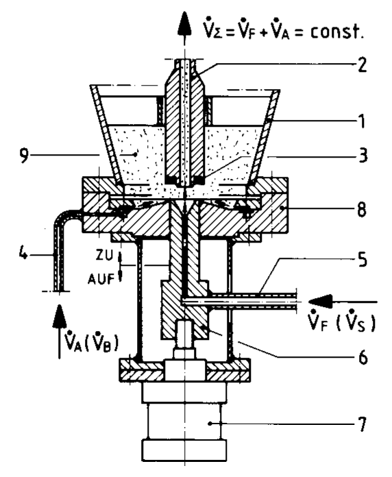Durch die Aufteilung des Gesamtgasstromes in Fördergas VF und Austragsgas VA ist die Möglichkeit einer Durchsatzänderung gegeben. Bei konstantem Gasstrom wächst die pro Zeiteinheit ausgetragene Feststoffmenge mit steigendemAustragsgasanteil. (Da das Trägergas nicht unbedingt immer Druckluft seinmuß, wird im folgenden allgemein vonGasstrom gesprochen).