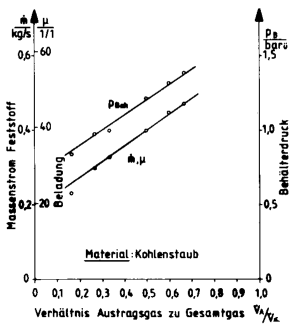 Um über den gesamten Regelbereichstabile Förderbedingungen in den Feststoffleitungen verwirklichen zu können,wird die Gesamtgasmenge V•Σ konstant gehalten. Dies bedeutet konstante Geschwindigkeit am Leitungsaustritt undunterschiedliche Drücke bzw. Geschwindigkeiten am Förderleitungsanfang. DieBeladung, d. h. das Verhältnis von Feststoff zu Gasdurchsatz, wird variiert. Ein Beispiel hierfür ist in Bild 4 angegeben.Man erkennt, daß eine nahezu lineare Abhängigkeit zwischen Feststoffdurchsatz