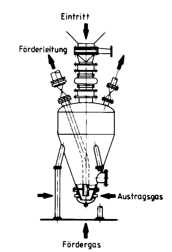 Bild 3 zeigt, daß der ankommendeGasstrom (Summengas) in zwei Teilgas-ströme (Fördergas und Austragsgas) aufgespalten wird. Das Fördergas VF tritt direkt zentrisch in das untere Ende der Förderleitung ein und übernimmt eine Träger- und Verdünnungsfunktion für dasmit dem seitlichen Austragsgasstrom VA einfließende Schüttgut. Dabei wird auf eine Fluidisierung bewußt verzichtet. DerMaterialfluß in die Förderleitung wirdzum einen durch den Entzug der Stützkräfte für die Materialschüttung entlangdes Bodens und zum anderen durch die Impulsübertragung des mit relativ hohenGeschwindigkeiten ringförmig austretenden Gasstrahles übernommen.