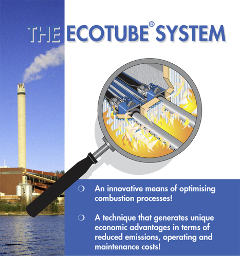 The Ecotube system represents an innovative cost-effective optimisation tool for combustion processes and principally comprises retractable lances - Ecotubes - that are equipped with injection nozzles. Various agents can be introduced through the nozzles at high pressure and velocity into the furnace media. The Ecotubes are strategically positioned within the furnace enabling the injected agents to create a radically improved mixing of the combustion products, resulting in destruction of laminar gas columns and the for¬mation of completely mixed turbulent flow patterns.